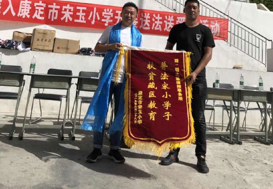 为表感谢,宋玉小学赠予我所“普法宋小学子,扶贫藏区教育”锦旗。
